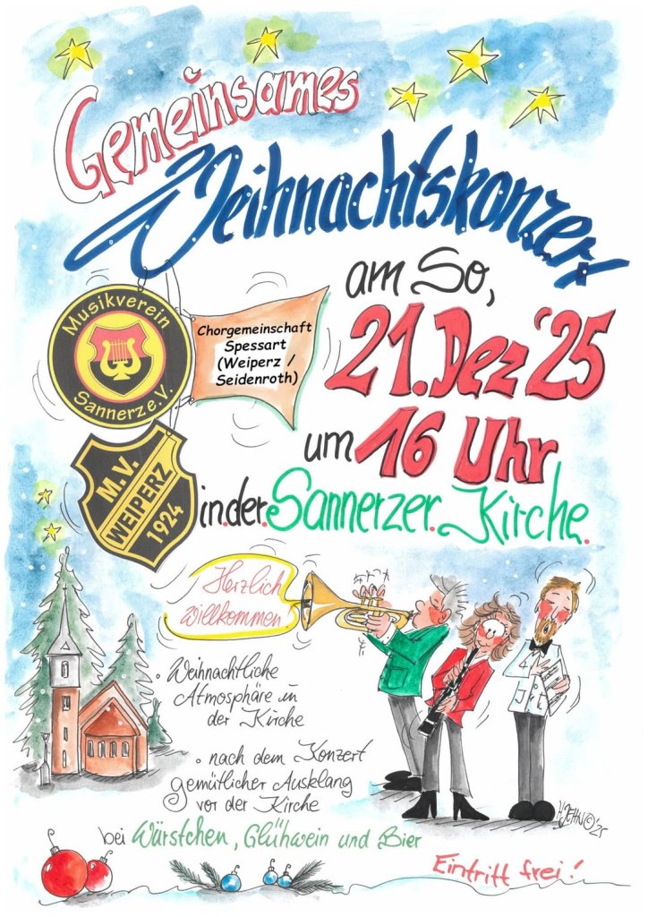 | Sonntag, 21. Dezember | Weihnachtskonzert mit MV Sannerz![]() | Kirche Sannerz | 16.00 – 18.00 Uhr |